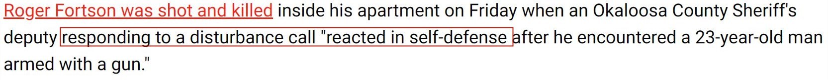 佛羅里達(dá)州奧卡魯沙縣警察局在事后發(fā)表的聲明中稱,涉事警察在案發(fā)當(dāng)天接到有關(guān)“擾亂公共秩序”的報(bào)警,后來在看到福特森持槍時(shí)出于“自衛(wèi)”才開火。
