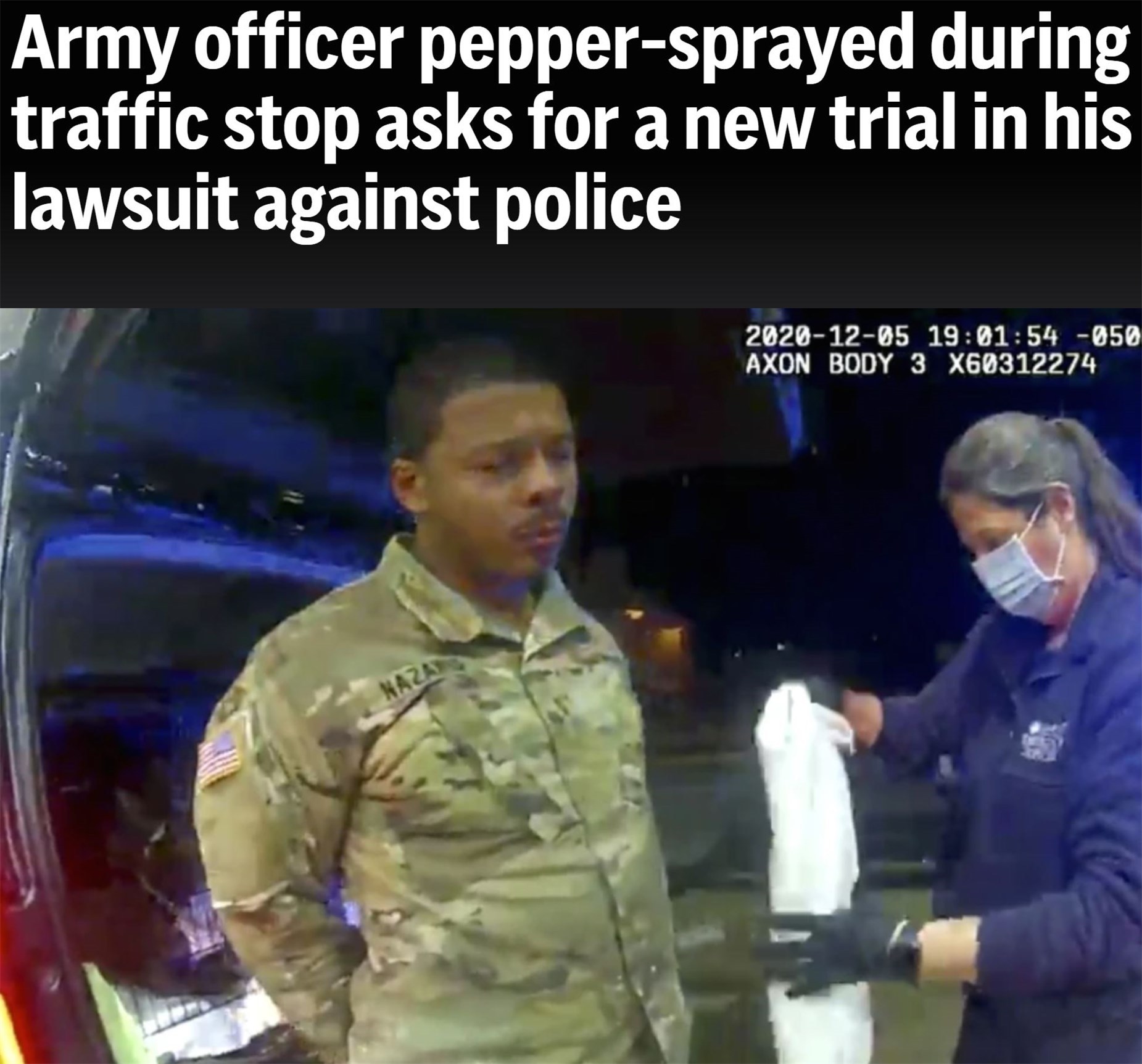 2020年12月,非洲和拉丁裔混血的美國(guó)陸軍少尉卡倫·納扎里奧在弗吉尼亞州溫莎市駕駛新買的汽車回家途中,遭遇兩名警察歧視性執(zhí)法。后者不僅以“無照駕車”為由用槍威逼納扎里奧下車,還對(duì)他進(jìn)行毆打并使用胡椒噴霧。