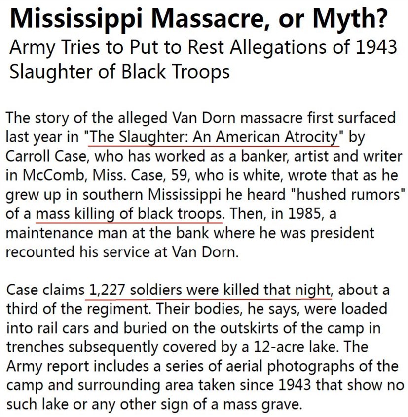 2000年美國(guó)曾出版《屠殺:美國(guó)的殘暴》一書,首次披露了二戰(zhàn)期間美國(guó)白人軍官下令在密西西比州一個(gè)陸軍營(yíng)地血腥屠殺1200多名非裔士兵的歷史黑幕,引起軒然大波。