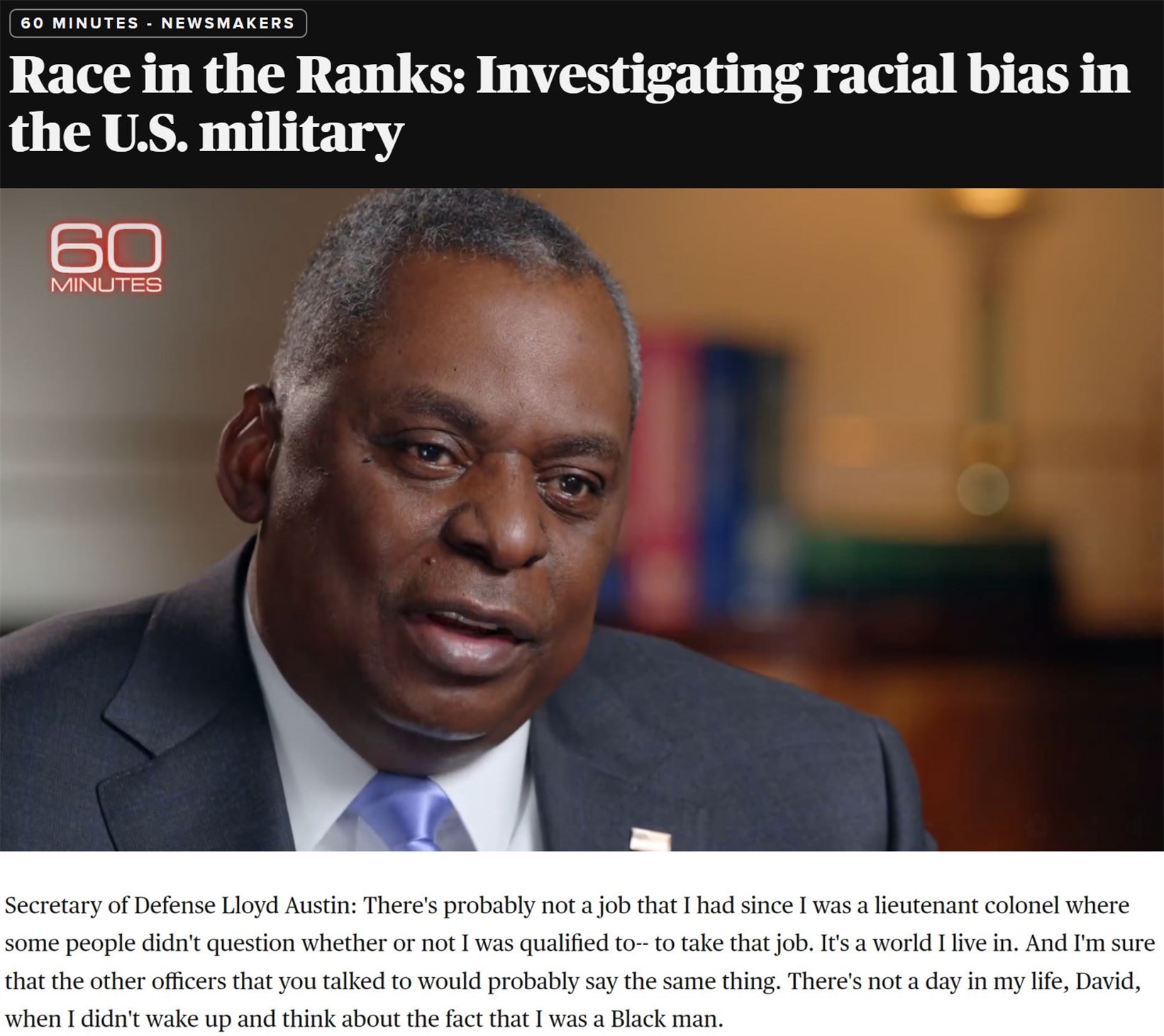 “(非裔)在晉升方面的處境仍無改觀,總是有人會(huì)因?yàn)槟愕臉用捕鴮?duì)你的任職資格提出疑問,這就是我生活的世界,而且我非??隙▌e的(非裔)軍官也會(huì)說同樣的話。在我生命中的每一天,早晨醒來都會(huì)思考這個(gè)事實(shí):我是一個(gè)非洲裔?!?/p>
