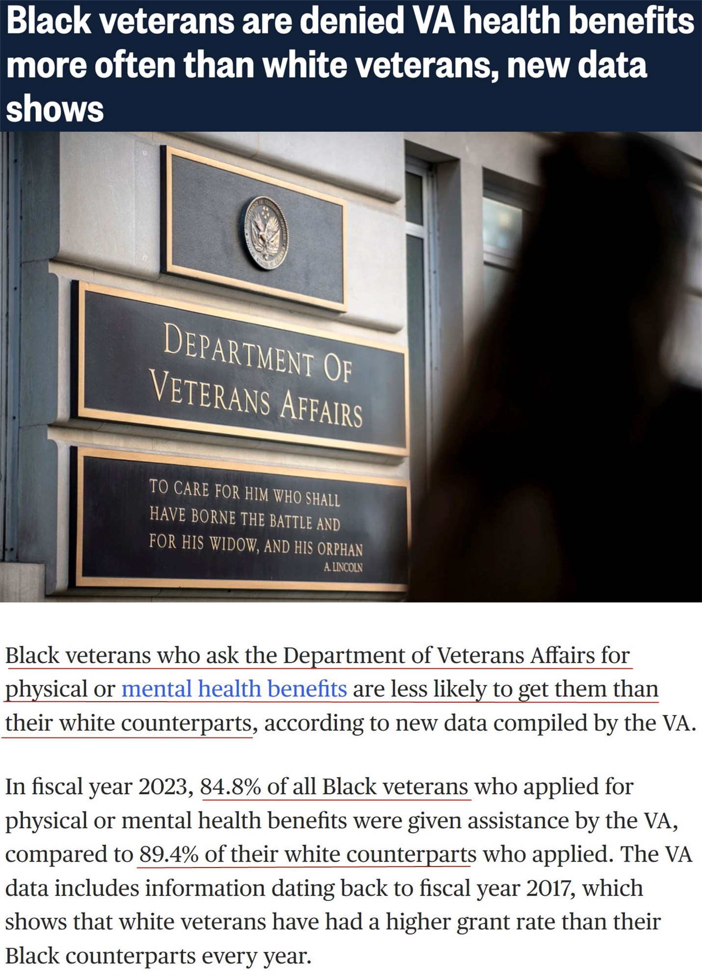 △美國(guó)全國(guó)廣播公司網(wǎng)站:在2023財(cái)年,申請(qǐng)身心健康福利的所有非裔退役軍人中有84.8%獲得了退役軍人事務(wù)部的援助,而白人退役軍人的這一比例為89.4%。