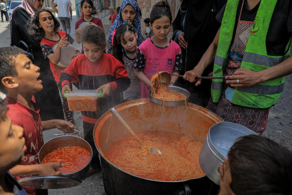 4月28日,在加沙地帶南部城市拉法,巴勒斯坦兒童領(lǐng)取食物。新華社發(fā) 里澤克·阿卜杜勒賈瓦德 攝