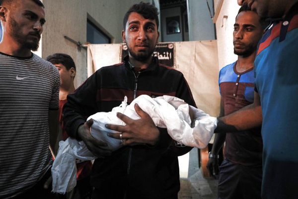 5月7日,在加沙地帶南部城市拉法的一家醫(yī)院,一名男子抱著在以色列空襲中喪生的兒童。新華社發(fā) 里澤克·阿卜杜勒賈瓦德 攝