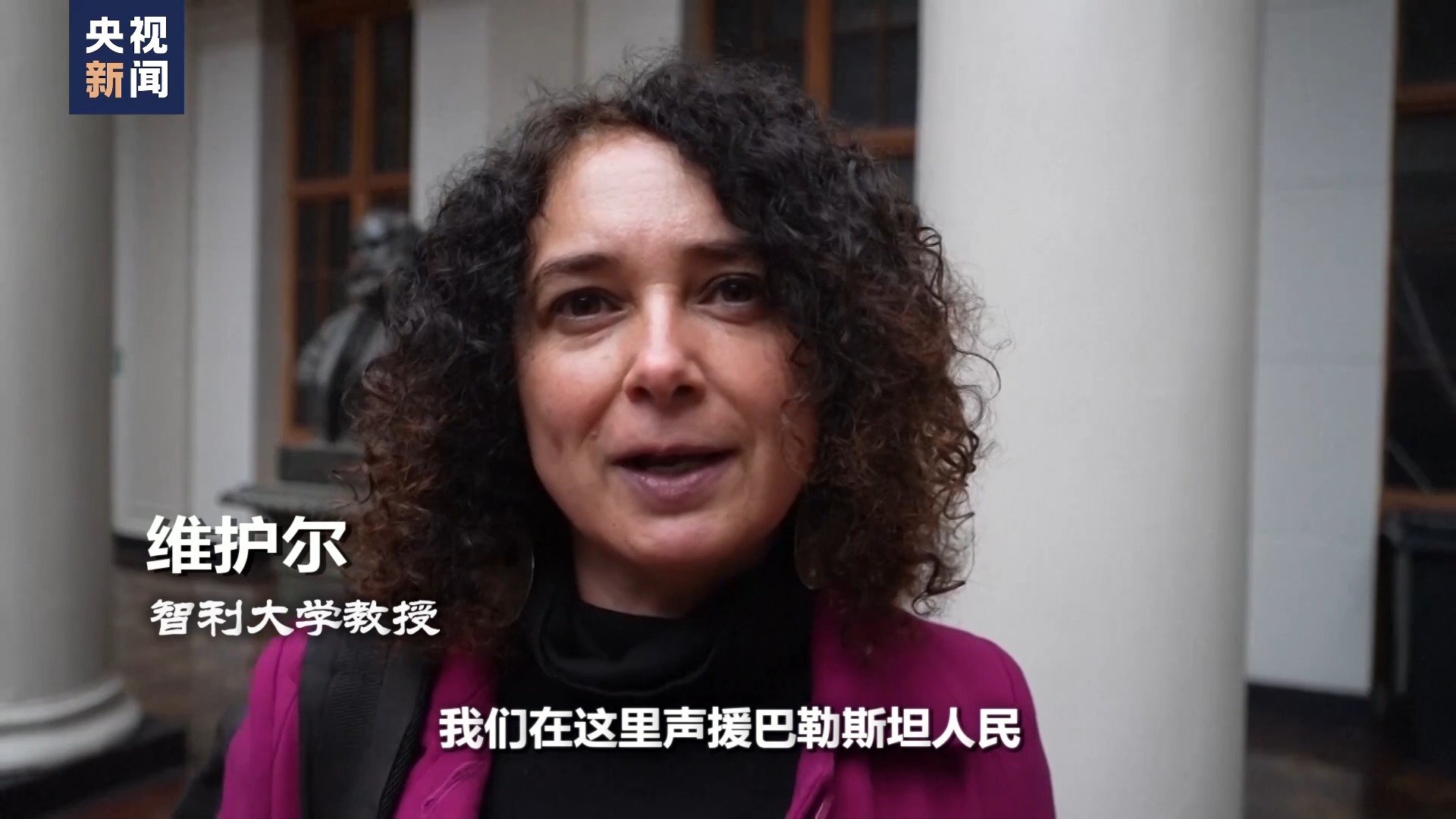 智利大學(xué)教授 維護爾:我們在這里聲援巴勒斯坦人民,并譴責(zé)針對平民,尤其是婦女兒童所進行的人權(quán)侵犯。