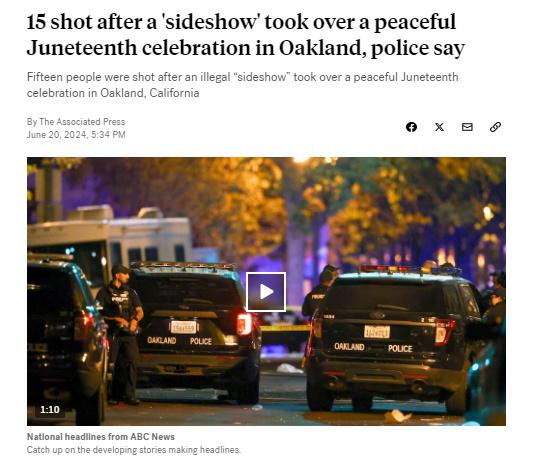 據(jù)報道,奧克蘭警方表示,槍擊事件發(fā)生在該市舉行的一場未經(jīng)批準的六月節(jié)慶祝活動期間。有人踩上一輛汽車引擎蓋引發(fā)斗毆,進而發(fā)生槍擊事件。