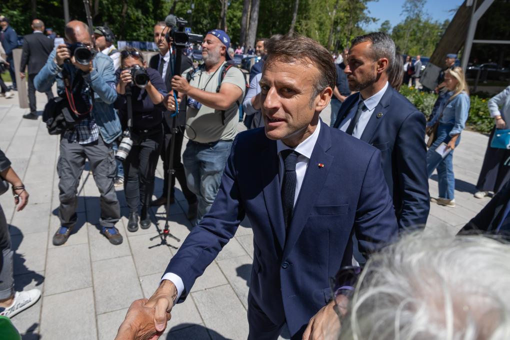 6月9日,在法國勒圖凱市一處投票站外,法國總統(tǒng)馬克龍(前)在參加歐洲議會選舉投票前與民眾交流。 新華社發(fā)(弗蘭克·博阿姆攝)