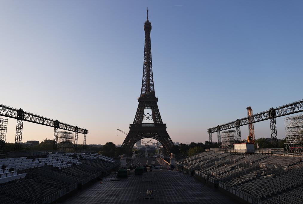 這是6月7日清晨在法國巴黎拍攝的懸掛奧運五環(huán)標(biāo)志的埃菲爾鐵塔以及正在搭建看臺的特羅卡德羅廣場,巴黎奧運會開幕式的慶?;顒訉⒃谶@里舉行。 新華社記者高靜攝