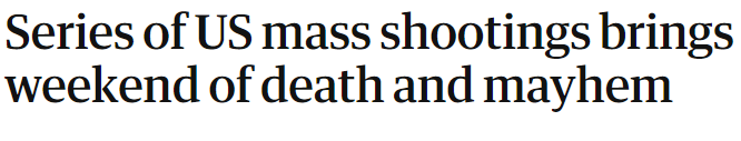 文章指出,周末發(fā)生的一系列大規(guī)模槍擊事件讓美國社會(huì)被死亡和混亂的陰影籠罩。在大規(guī)模槍擊案發(fā)生頻率如此之高的背景下,美國民眾呼吁加強(qiáng)槍支管控的聲音日益強(qiáng)烈,但聯(lián)邦政府通常對(duì)此無動(dòng)于衷或無能為力。