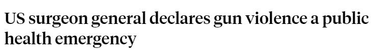 據(jù)美國廣播公司(ABC)25日報道,美國衛(wèi)生局局長維維克·穆西當(dāng)天宣布,槍支暴力成為一場公共衛(wèi)生危機,原因是涉及槍支的傷亡人數(shù)快速增長。