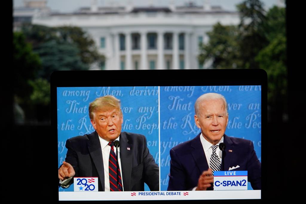 這張2020年9月29日在美國弗吉尼亞州阿靈頓拍攝的視頻畫面顯示,時任美國總統(tǒng)特朗普(左)與時任美國民主黨總統(tǒng)候選人拜登在俄亥俄州克利夫蘭市參加2020年美國總統(tǒng)候選人首場電視辯論。新華社記者 劉杰 攝