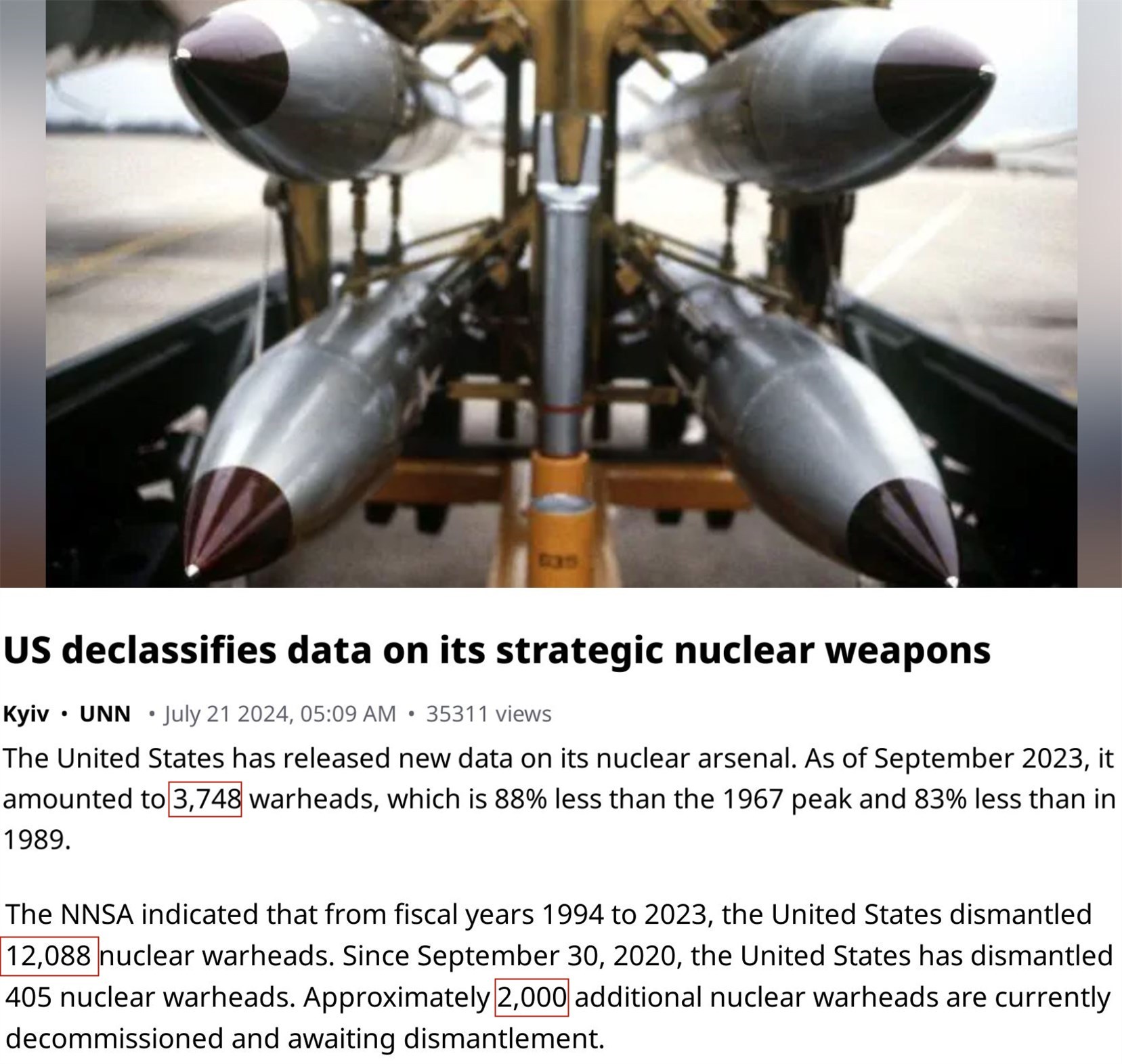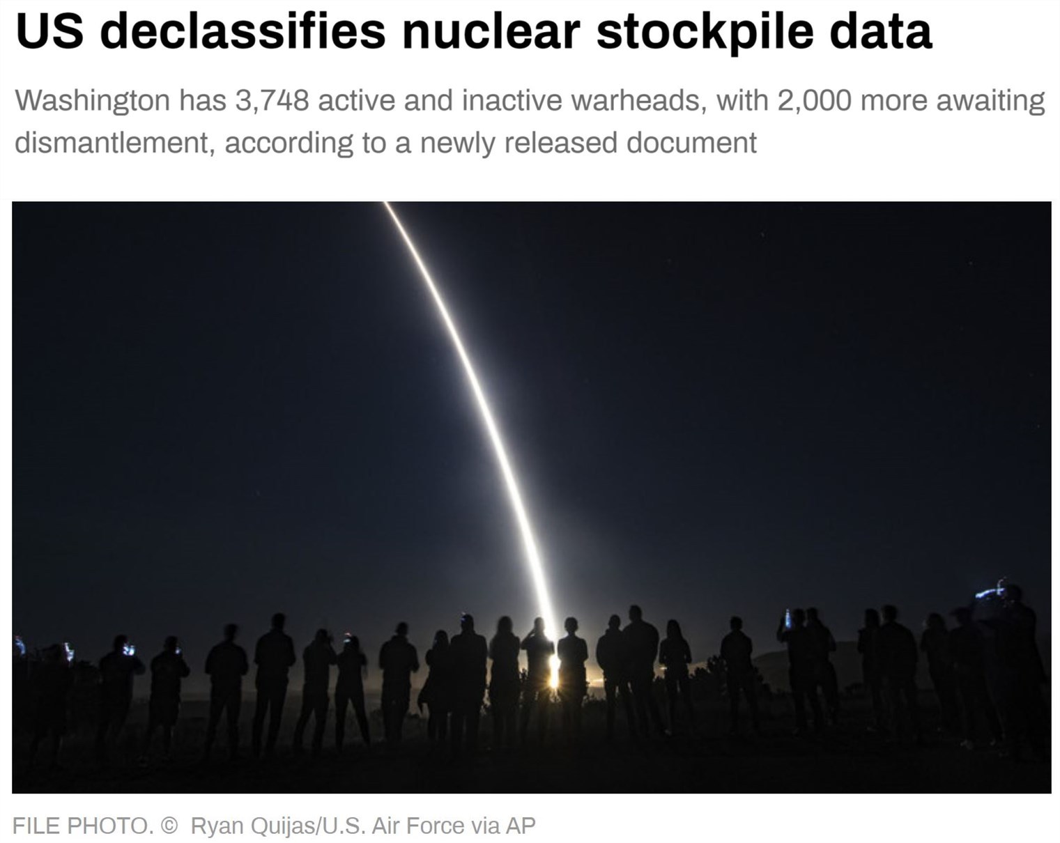 美國能源部下屬的國家核安全管理局近日表示,截至2023年9月,美國核武庫共有3748枚核彈頭。從1994財年到2023財年,美國銷毀了超過1.2萬枚核彈頭。另有2000枚核彈頭已經(jīng)淘汰并等待處置。