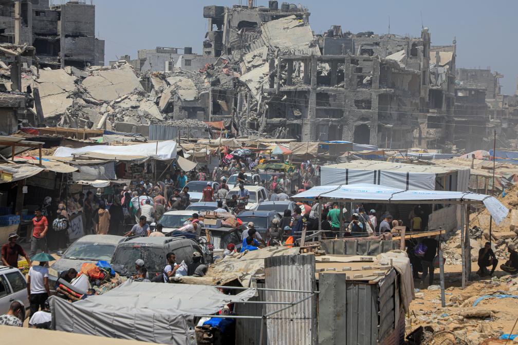 7月22日,在加沙地帶南部城市汗尤尼斯,人們逃離家園。巴勒斯坦加沙地帶衛(wèi)生部門22日說,以色列軍隊(duì)當(dāng)天轟炸汗尤尼斯,造成至少70人死亡、超過200人受傷。新華社發(fā)(里澤克·阿卜杜勒賈瓦德攝)