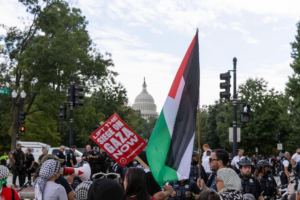 7月24日,抗議者在美國首都華盛頓國會附近的聯(lián)合車站聚集。當日,數(shù)以千計的示威者在國會大廈外抗議內(nèi)塔尼亞胡在國會發(fā)表演講。新華社記者胡友松攝