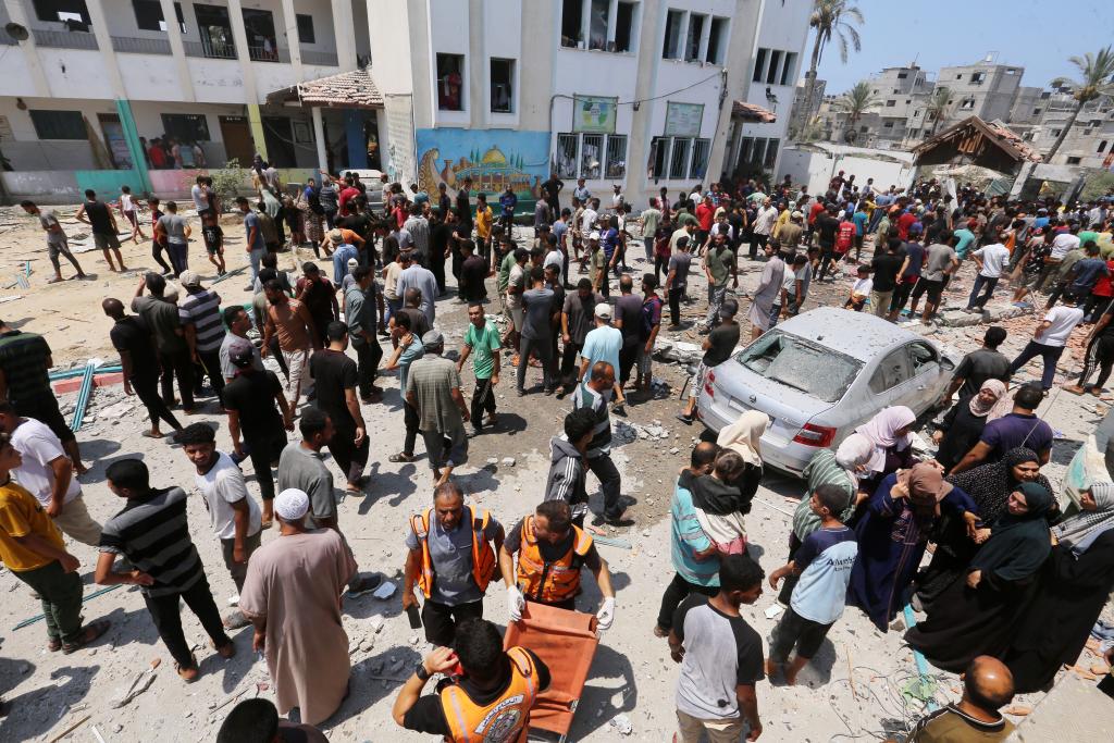 7月27日,巴勒斯坦加沙地帶衛(wèi)生部門發(fā)表聲明說,以色列軍隊當天轟炸加沙地帶中部代爾拜拉赫一家野戰(zhàn)醫(yī)院,造成至少30人死亡、超過100人受傷。圖為人們聚集在以軍襲擊現(xiàn)場附近。新華社發(fā)(里澤克·阿卜杜勒賈瓦德攝)