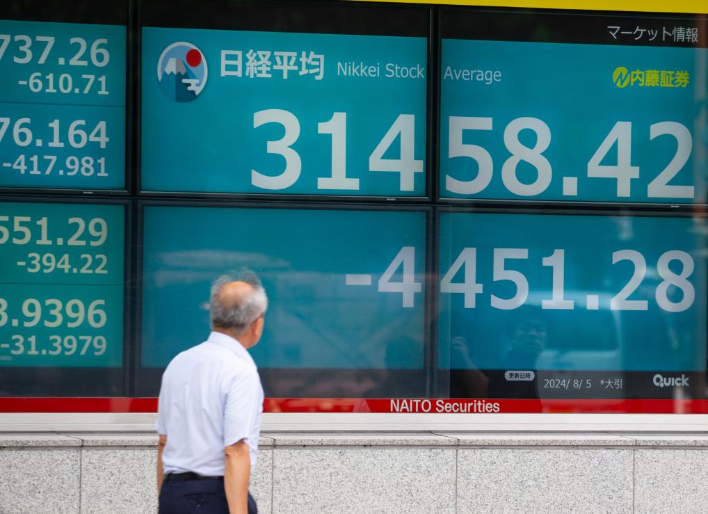 8月5日,行人走過(guò)位于日本東京的顯示實(shí)時(shí)股價(jià)的電子屏幕。新華社記者岳晨星攝