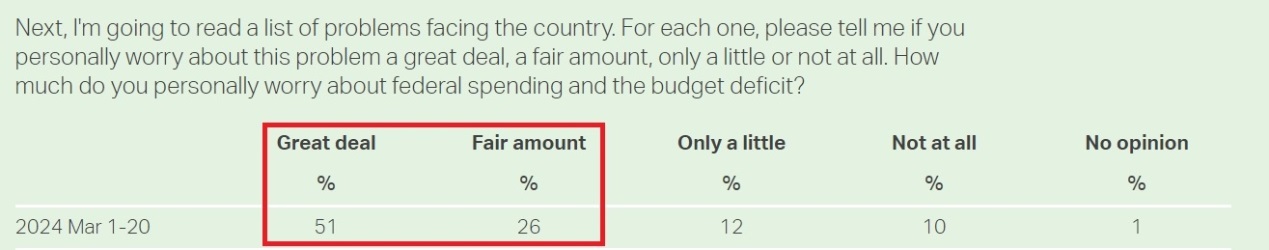 美國民意調(diào)查機(jī)構(gòu)蓋洛普公司今年進(jìn)行的一份關(guān)于美國聯(lián)邦債務(wù)的調(diào)查結(jié)果顯示,對(duì)聯(lián)邦債務(wù)問題感到“非常擔(dān)心”和“嚴(yán)重?fù)?dān)心”的受訪者達(dá)到77%。