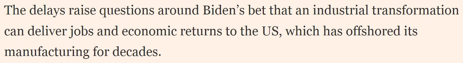 按照《金融時(shí)報(bào)》的說法,項(xiàng)目遲滯令輿論質(zhì)疑拜登政府所篤定的工業(yè)轉(zhuǎn)型有望為美國帶來就業(yè)和經(jīng)濟(jì)回報(bào)的說法。