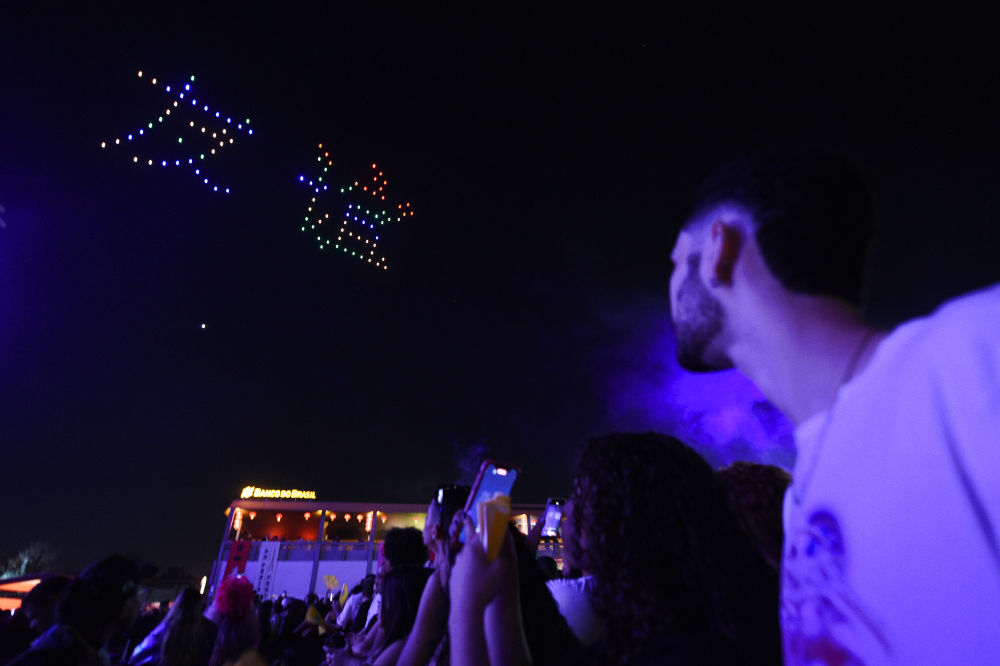 ↑8月17日,在巴西首都巴西利亞,人們在沙灘藝術(shù)節(jié)中國日活動上觀看無人機表演。