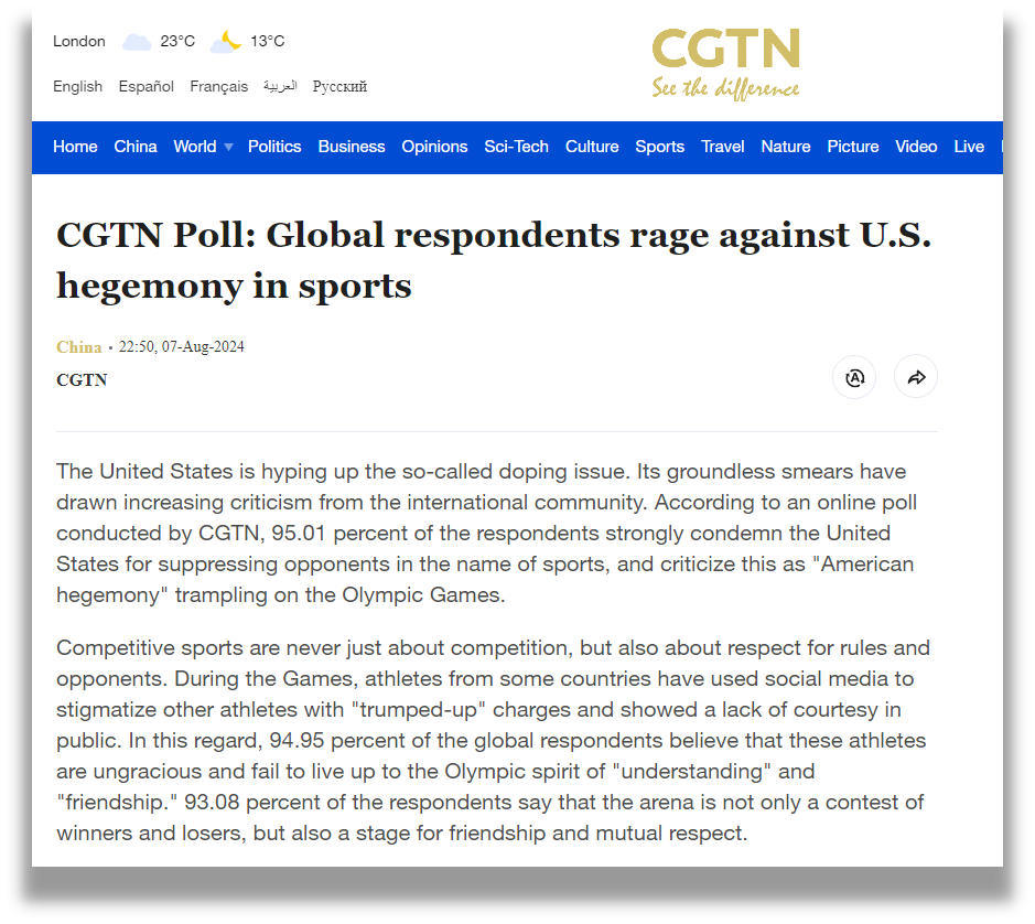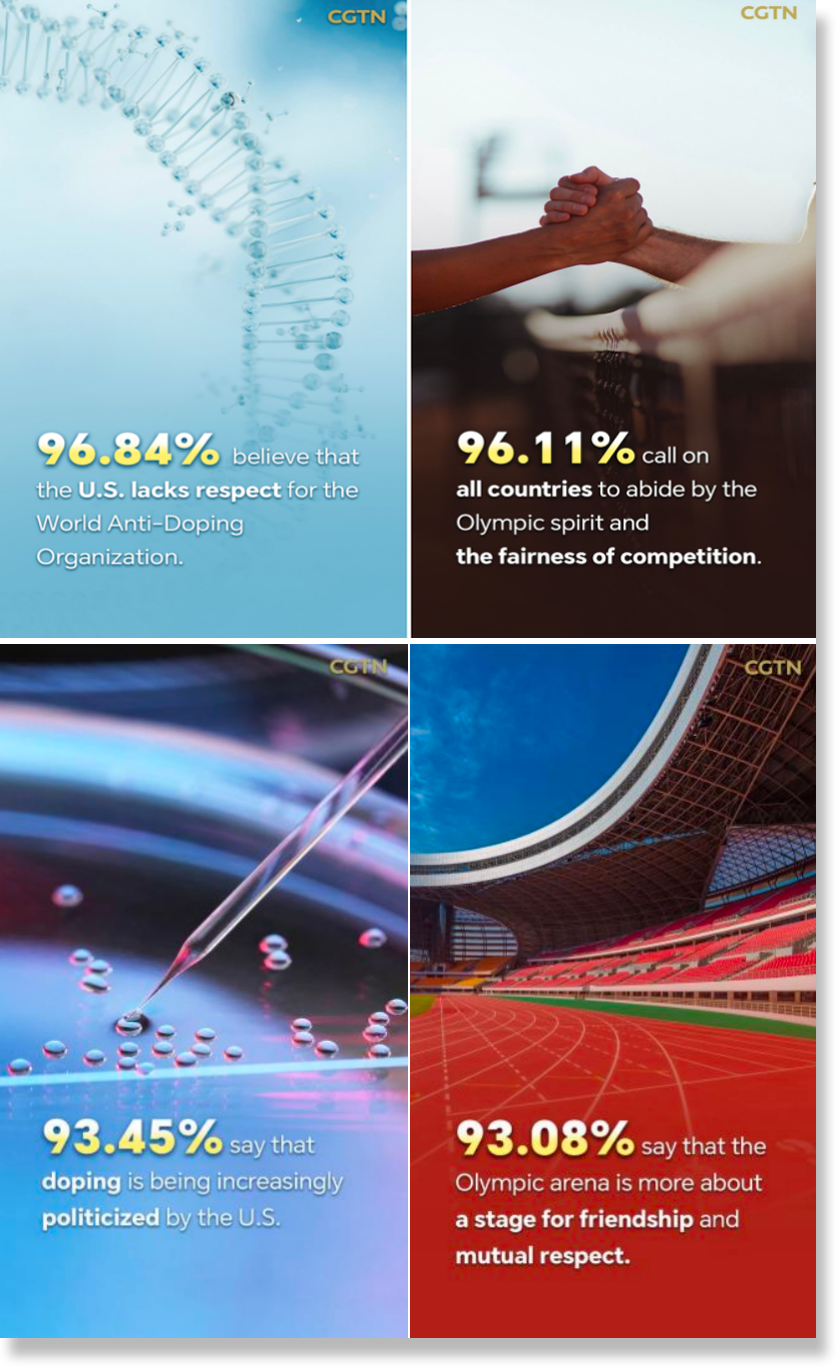 總臺(tái)CGTN先后兩次發(fā)起全球民調(diào),調(diào)查顯示,96.84%的受訪者認(rèn)為美方缺乏對(duì)世界反興奮劑機(jī)構(gòu)的尊重,是在挑戰(zhàn)公平和權(quán)威;96.25%的受訪者痛批美國(guó)在興奮劑監(jiān)管方面“雙重標(biāo)準(zhǔn)”;93.45%的受訪者表示,興奮劑問題日益被美國(guó)政治化和工具化;95.57%的受訪者認(rèn)為美國(guó)反興奮劑機(jī)構(gòu)或存包庇行為,為涉興奮劑的美國(guó)運(yùn)動(dòng)員開脫……
