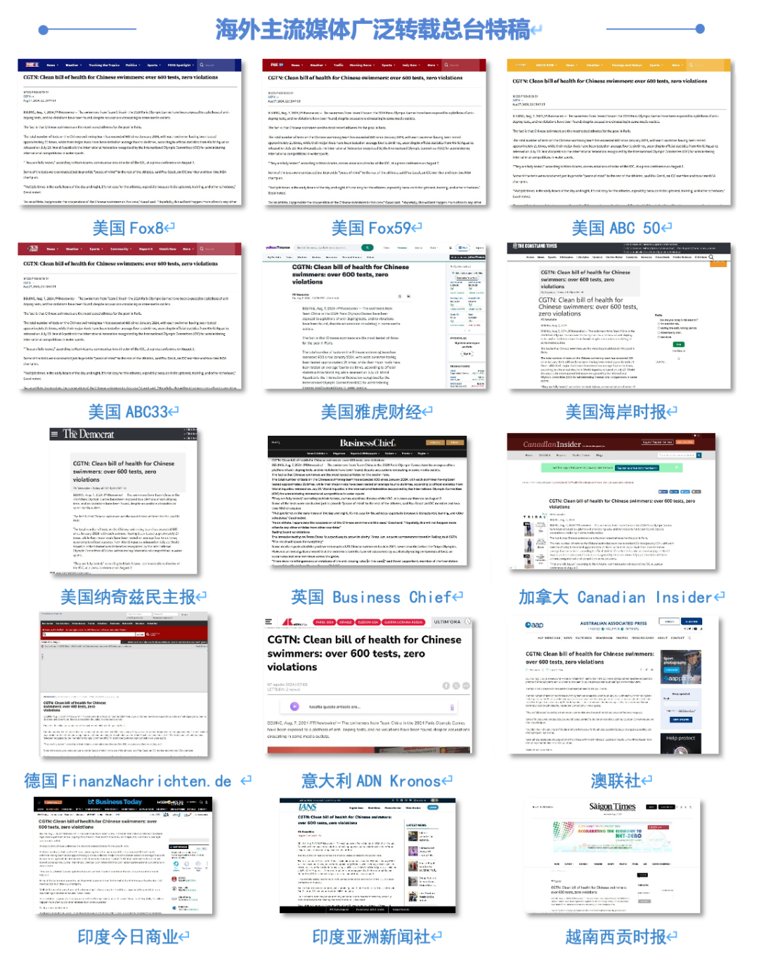 針對(duì)美西方借興奮劑抹黑中國(guó)這一議題,總臺(tái)多語種對(duì)外傳播平臺(tái)與海外總站、國(guó)際視頻通訊社緊密聯(lián)動(dòng),通過全球媒體伙伴網(wǎng)絡(luò),不斷放大正義的音量。僅在3天內(nèi),就有1800余家海外主流媒體積極轉(zhuǎn)載總臺(tái)多語種特稿,創(chuàng)下短時(shí)傳播新紀(jì)錄,引發(fā)國(guó)際輿論高度關(guān)注和強(qiáng)烈反響。