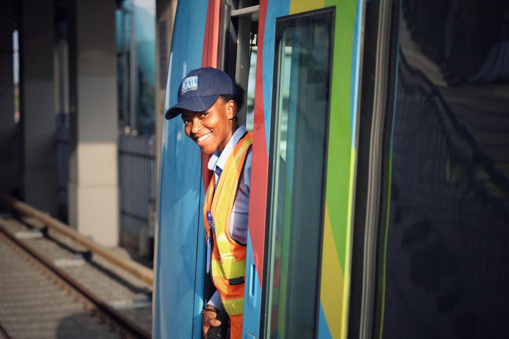 6月12日,在尼日利亞拉各斯,拉各斯輕軌藍(lán)線(xiàn)項(xiàng)目動(dòng)車(chē)組列車(chē)司機(jī)組長(zhǎng)伊莎貝拉·亞當(dāng)斯·伊斯拉埃爾與列車(chē)合影。新華社發(fā),中土集團(tuán)尼日利亞有限公司供圖