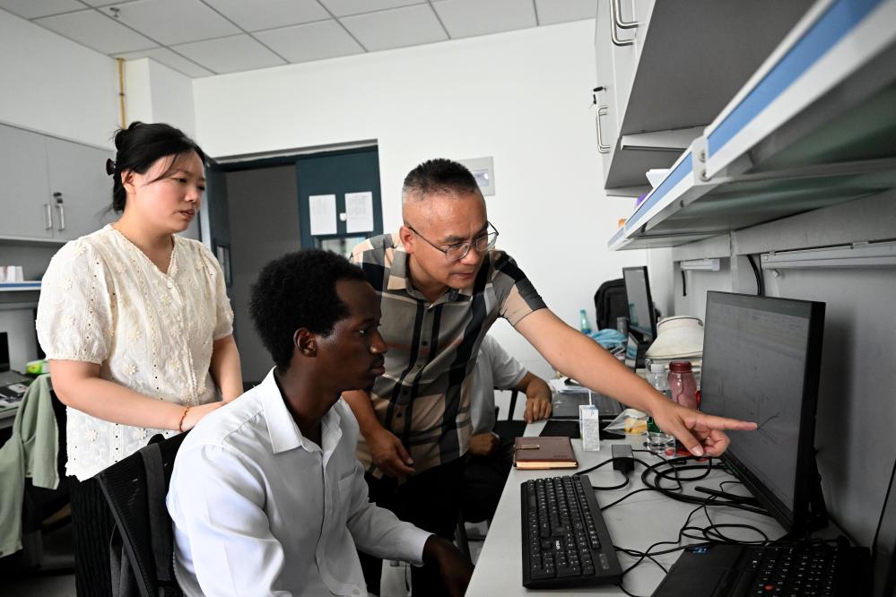 8月13日,在位于安徽省合肥市的安徽農(nóng)業(yè)大學(xué),中方導(dǎo)師在指導(dǎo)一名盧旺達(dá)學(xué)生和其他學(xué)生學(xué)習(xí)。新華社記者黃博涵攝