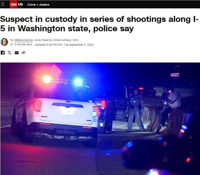 據(jù)美國有線電視新聞網(CNN)3日報道,美國官員們稱,華盛頓州西雅圖和塔科馬市5號州際公路部分路段發(fā)生一系列槍擊事件,造成6人受傷,嫌疑人已被拘捕。