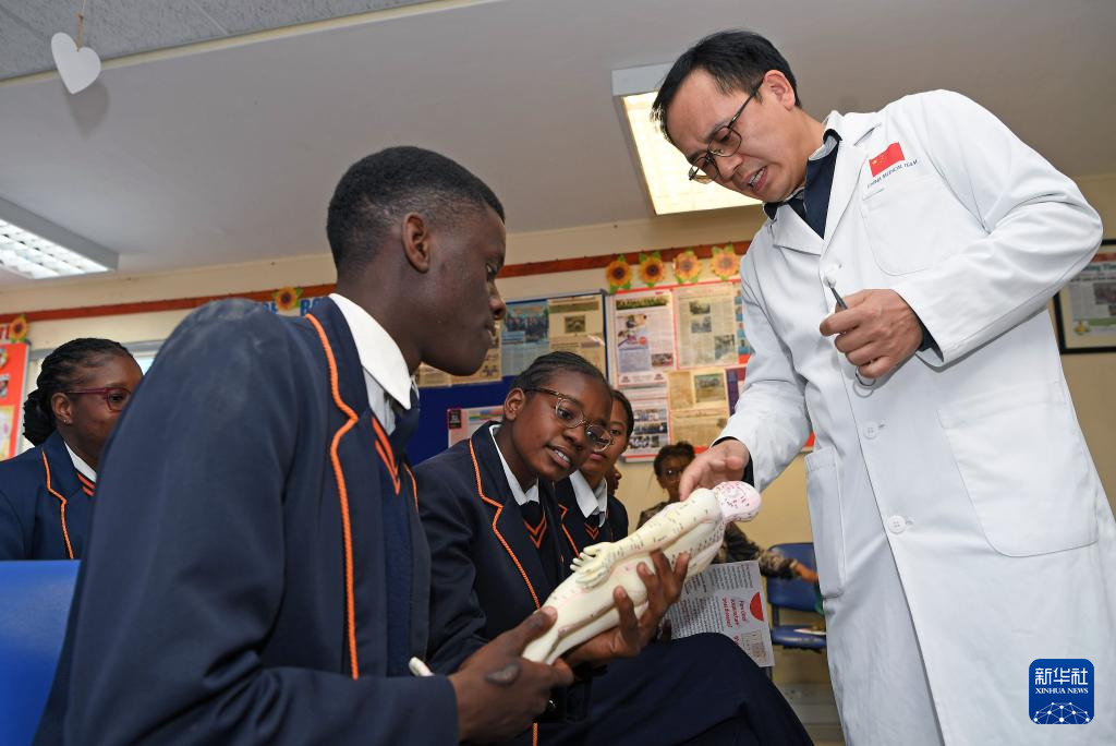 8月14日,在納米比亞首都溫得和克的一所私立學(xué)校,中國(guó)第15批援納米比亞醫(yī)療隊(duì)隊(duì)長(zhǎng)李邦偉在課堂上為學(xué)生們介紹人體經(jīng)絡(luò)。新華社記者 陳誠(chéng) 攝