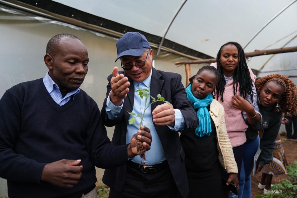 2023年9月18日,在肯尼亞納庫(kù)魯郡舉辦的中非農(nóng)業(yè)發(fā)展和減貧示范村番茄生產(chǎn)培訓(xùn)班上,來自中國(guó)的農(nóng)學(xué)教授劉高瓊(左二)為肯方學(xué)員指導(dǎo)農(nóng)業(yè)技術(shù)。新華社記者 韓旭 攝