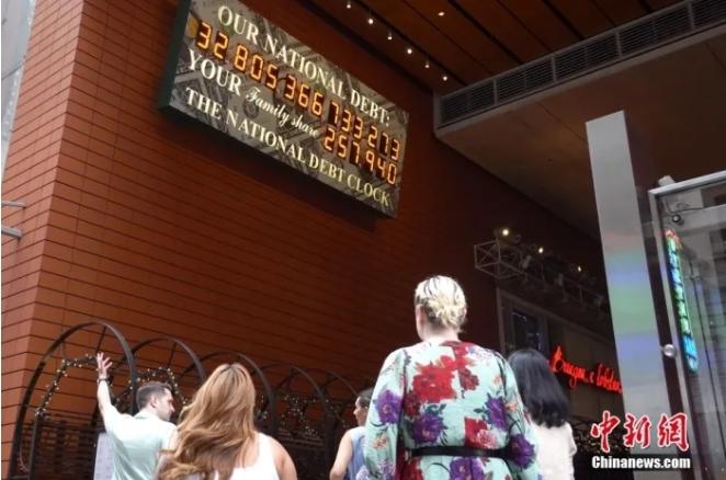 圖為2023年8月15日,紐約曼哈頓,美國(guó)“國(guó)債鐘”顯示屏前的背影。中新社記者 王帆 攝