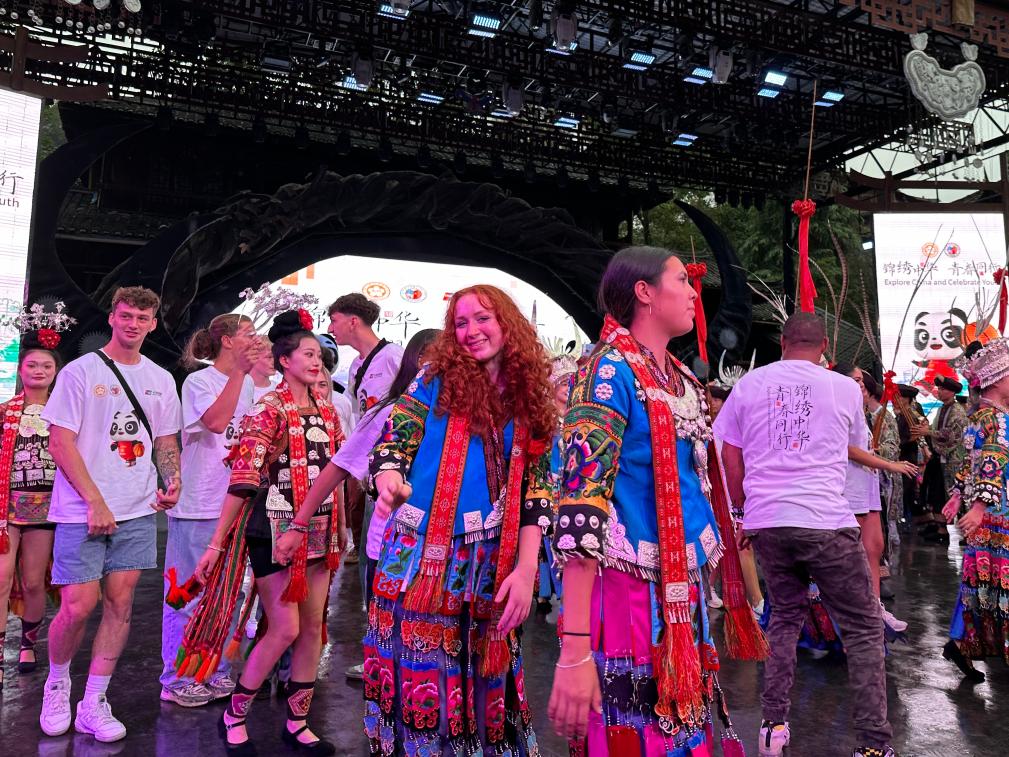 9月16日,美國(guó)青少年在貴州西江千戶苗寨體驗(yàn)苗族服飾及舞蹈。新華社記者 袁睿 攝