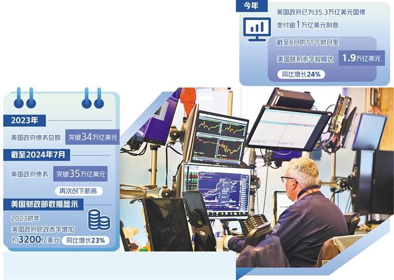 美國(guó)財(cái)政部9月12日發(fā)布的月度聯(lián)邦政府收支報(bào)告顯示,今年美國(guó)政府已為35.3萬(wàn)億美元國(guó)債支付逾1萬(wàn)億美元利息。償債成本上升也與美國(guó)8月財(cái)政赤字大幅上升相吻合。截至8月的前11個(gè)財(cái)月里,美國(guó)聯(lián)邦赤字規(guī)模達(dá)1.9萬(wàn)億美元,同比增長(zhǎng)24%。美國(guó)財(cái)政赤字曾在2020財(cái)年達(dá)到3.13萬(wàn)億美元的峰值,此后兩年雖呈下降趨勢(shì),但在2023財(cái)年又有所上漲:美國(guó)財(cái)政部數(shù)據(jù)顯示,2023財(cái)年美國(guó)政府的財(cái)政赤字增加了約3200億美元,同比增長(zhǎng)23%。一方面,經(jīng)濟(jì)的衰退和各種減稅法案的實(shí)施導(dǎo)致財(cái)政收入減少;另一方面,為刺激經(jīng)濟(jì)增長(zhǎng),財(cái)政支出又不斷增加,這就導(dǎo)致財(cái)政赤字不斷攀升,只有通過(guò)發(fā)債彌補(bǔ)財(cái)政赤字,形成惡性循環(huán)。