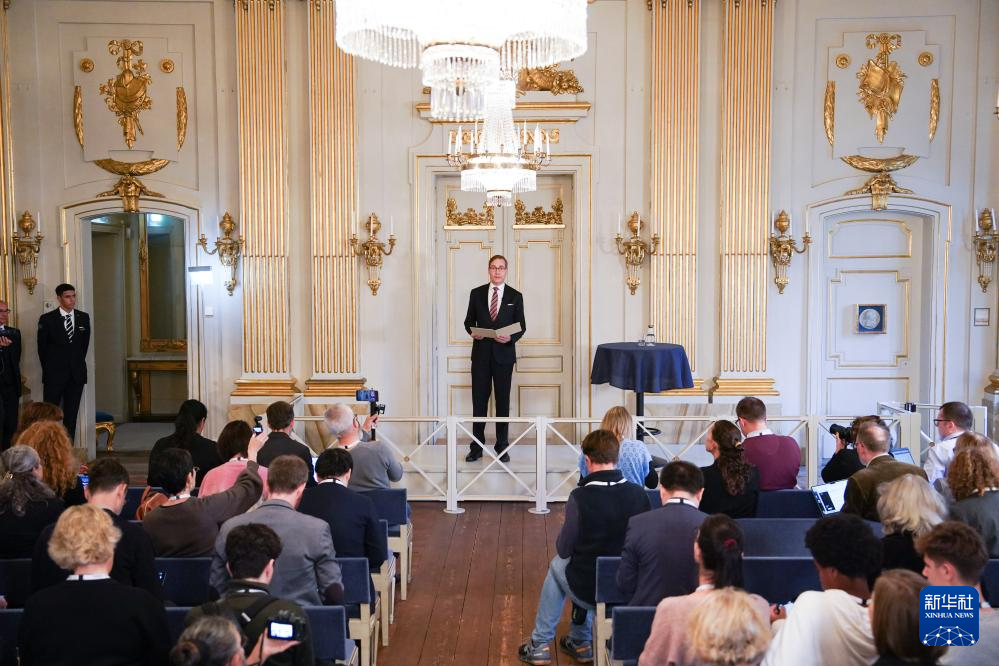 10月10日,瑞典文學(xué)院常任秘書馬茨·馬爾姆在斯德哥爾摩舉行的新聞發(fā)布會(huì)上揭曉獲獎(jiǎng)?wù)摺P氯A社記者 彭子洋 攝