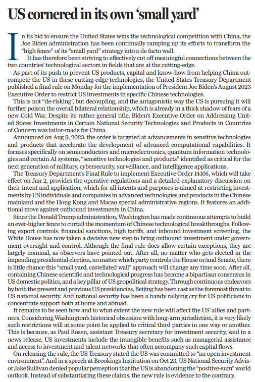 此前,外界普遍認(rèn)為美國正在放棄“正和”的世界觀。10月23日,美國總統(tǒng)國家安全事務(wù)助理沙利文在布魯金斯學(xué)會上發(fā)言時否認(rèn)了這一說法。隨后,美國財政部在發(fā)布最終規(guī)則時也表示,美國致力于建設(shè)“開放的投資環(huán)境”。然而,最終規(guī)則的發(fā)布,終究讓美國的“言”與“行”背道而馳。