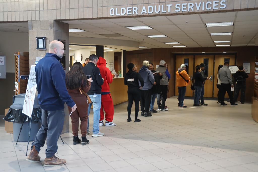 10月28日,在美國密歇根州奧克蘭縣諾維,選民在投票站排隊等待參加提前投票。新華社記者 徐劍梅 攝