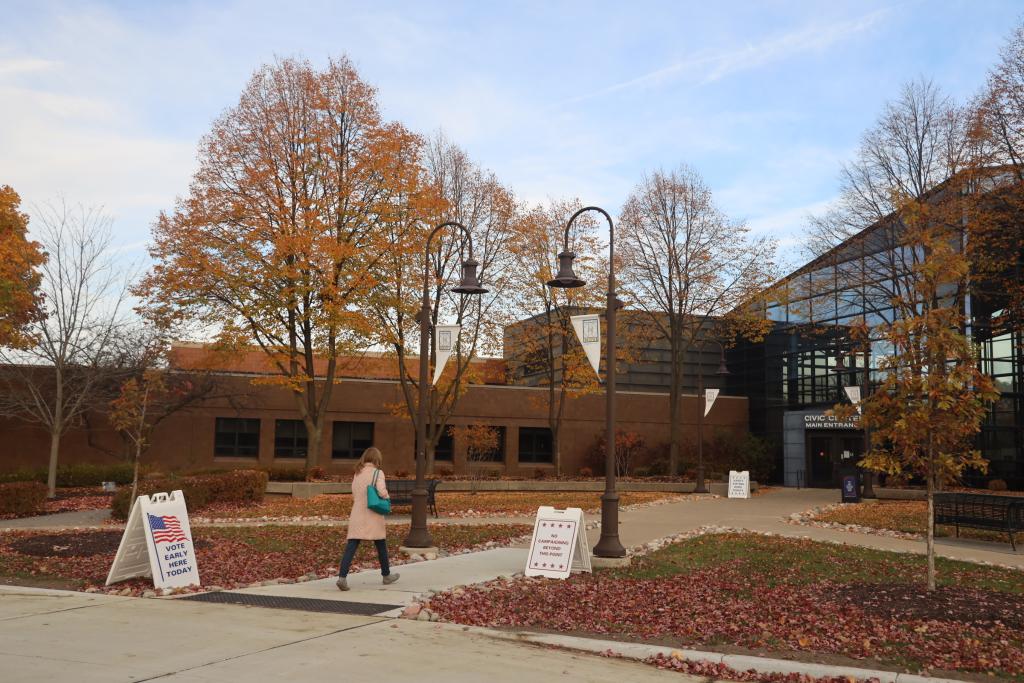 10月28日,在美國密歇根州奧克蘭縣諾維,一名女子前往投票站參加提前投票。新華社記者 徐劍梅 攝