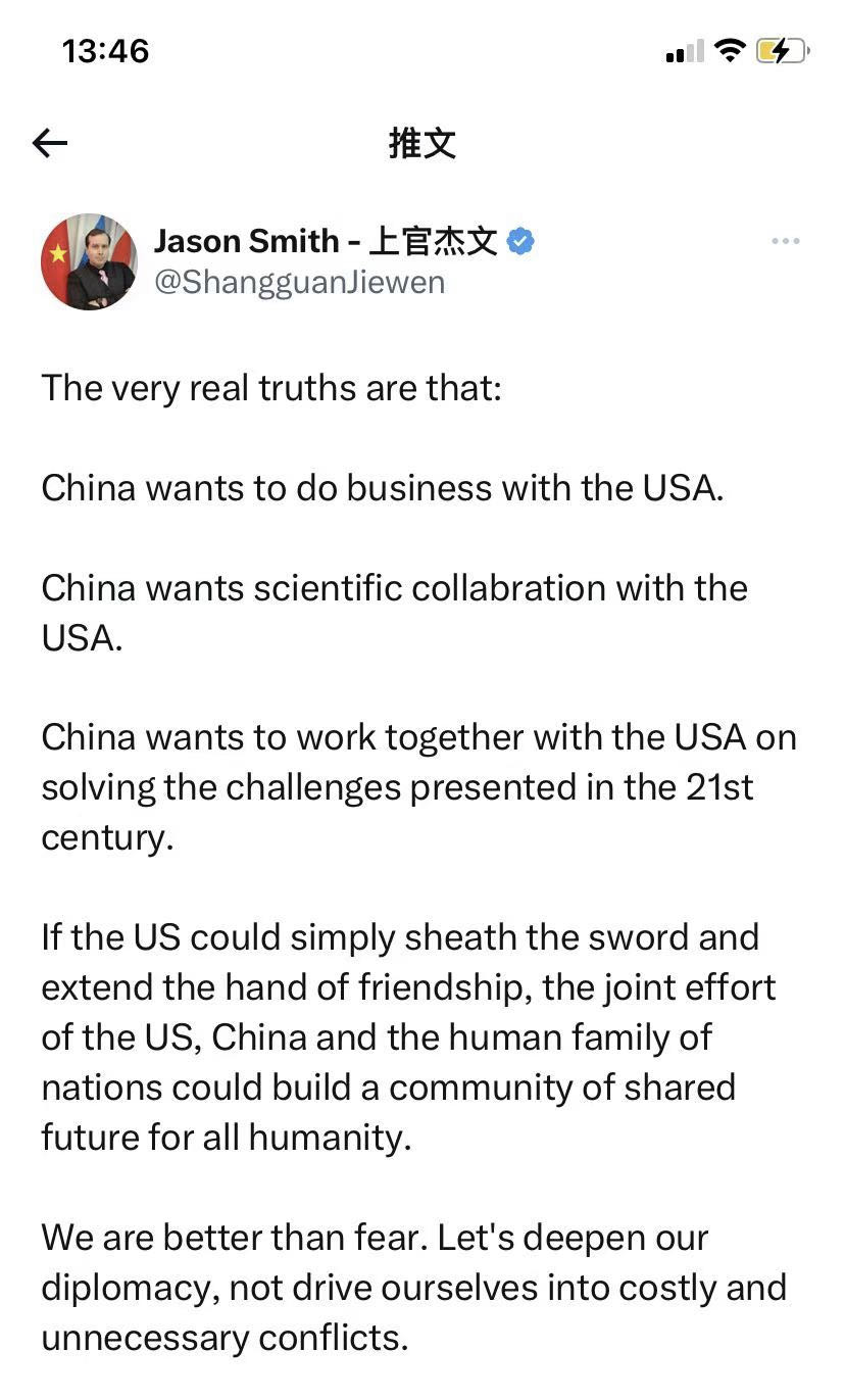 中國(guó)日?qǐng)?bào)網(wǎng)12月3日電 近期,美國(guó)博主上官杰文(Jason Smith)發(fā)了一則呼吁美中合作的推特引發(fā)海外網(wǎng)友熱議。