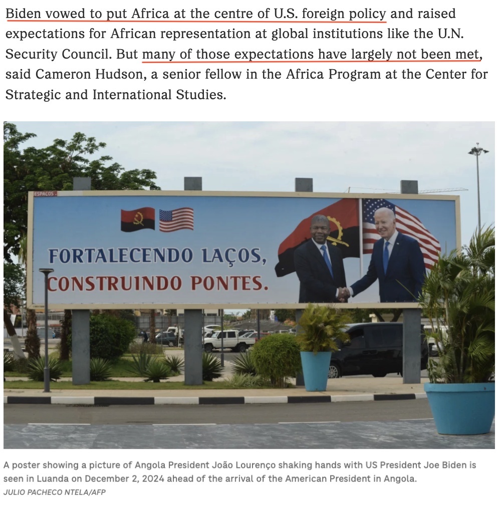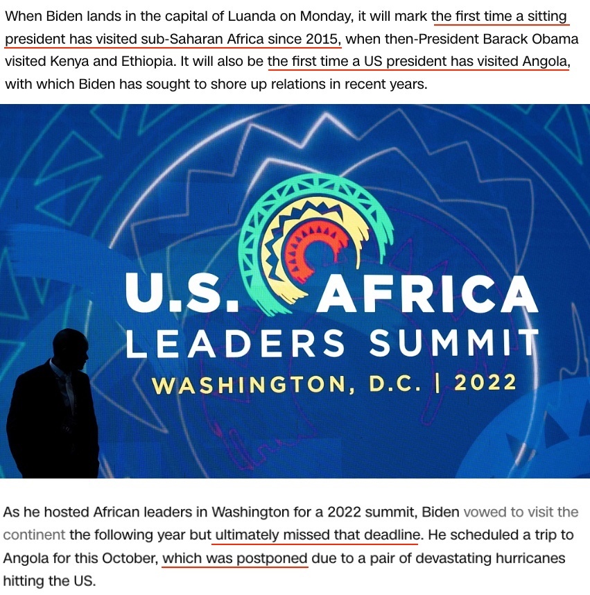 △美國有線電視新聞網(wǎng)報道:這是一場拖了太久的訪問。2022年在華盛頓舉行的美非峰會上,拜登曾承諾2023年訪問非洲,但他食言了。即便是這次原本安排在10月的安哥拉之行也因美國國內(nèi)發(fā)生颶風災害而推遲。