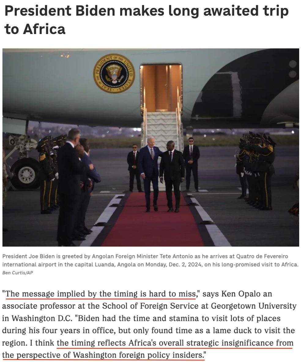 美國華盛頓特區(qū)喬治城大學外交學院副教授肯·奧帕羅認為,拜登在即將卸任時才抽出時間訪問非洲地區(qū),“從華盛頓外交政策內(nèi)部人士的角度來看,這個時機反映了非洲在美國總體戰(zhàn)略中的不重要性”。