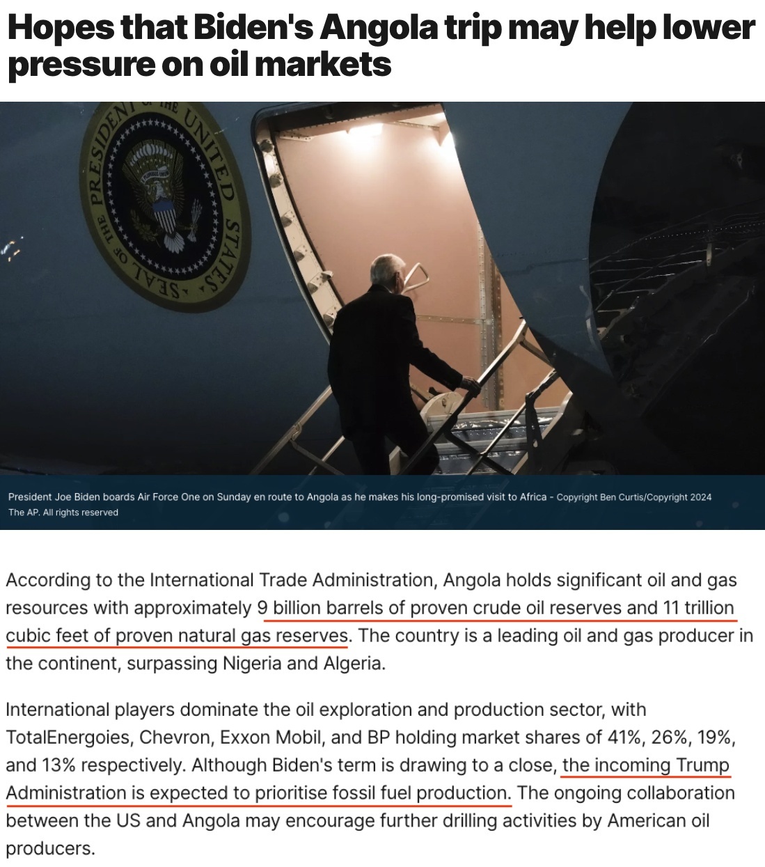 雖然拜登的任期即將結(jié)束,但預計即將上任的特朗普政府將優(yōu)先考慮化石燃料生產(chǎn)。美國和安哥拉之間正在進行的合作可能會鼓勵美國石油生產(chǎn)商進一步開展鉆探活動。
