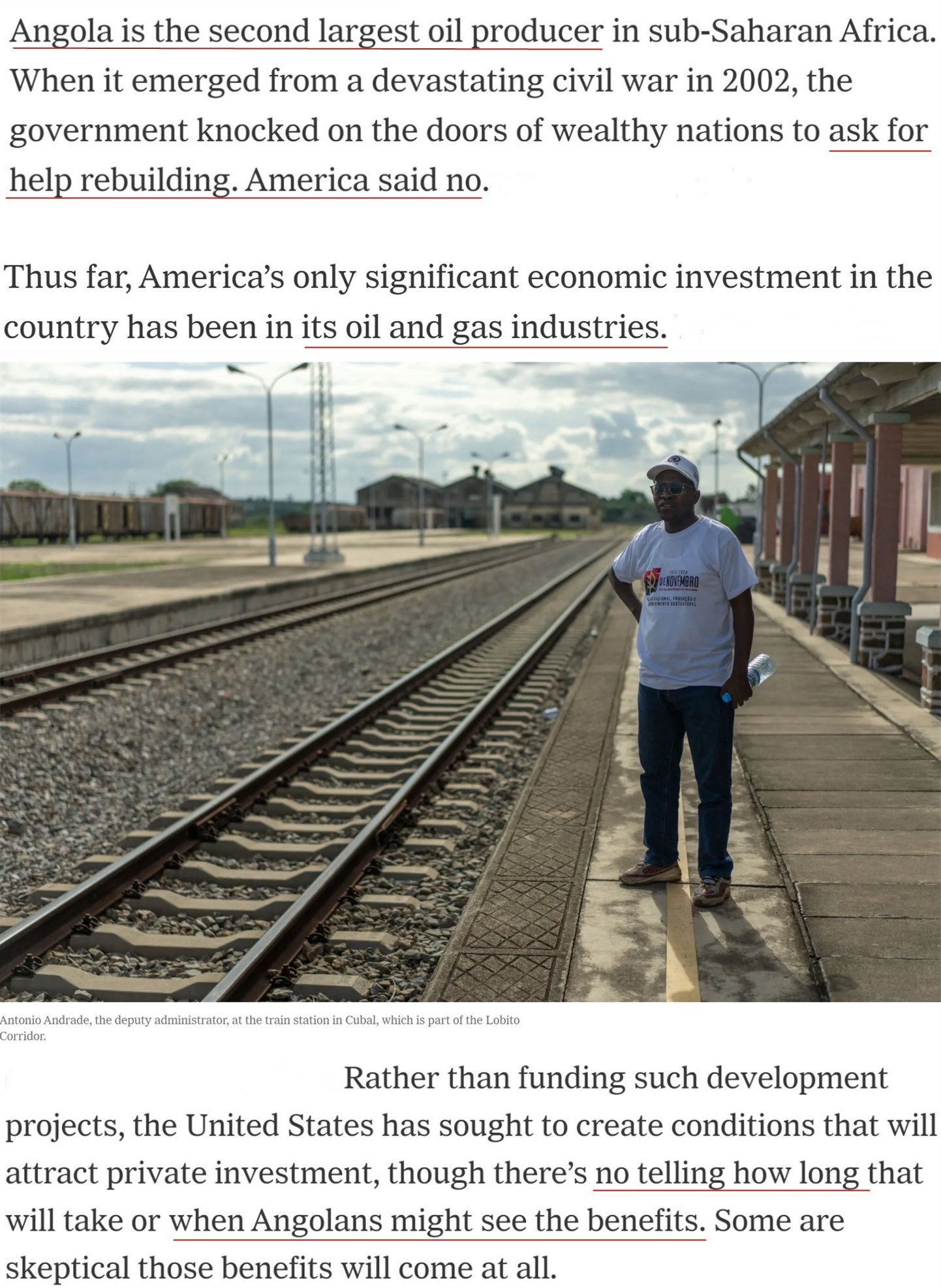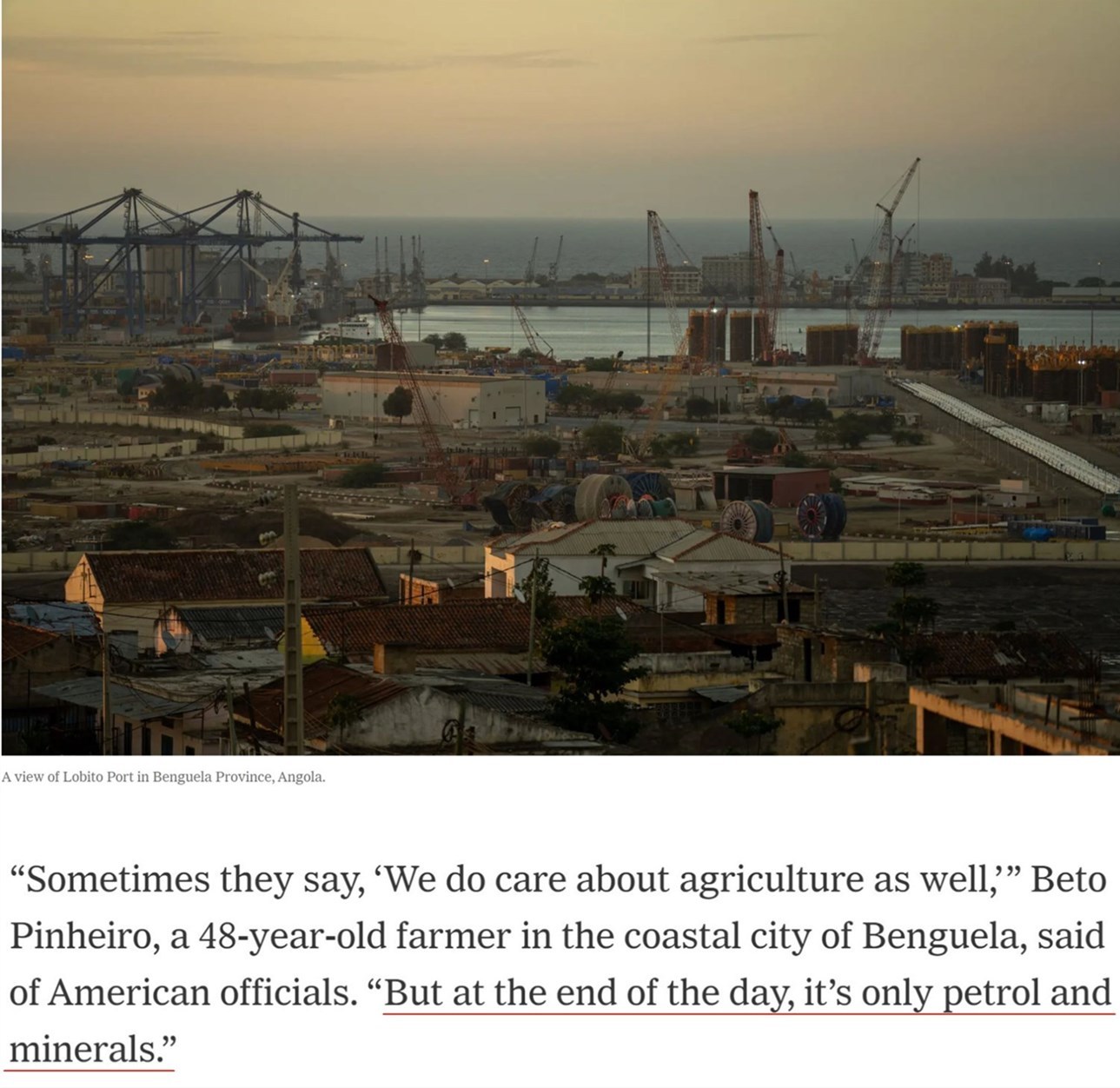 家住安哥拉沿海城市本格拉的48歲農(nóng)民貝托·皮涅羅說:“有時他們(美國官員)會說,‘我們也關(guān)心(安哥拉的)農(nóng)業(yè)’……但歸根結(jié)底,(美國關(guān)心的)只有石油和礦產(chǎn)?!?/p>