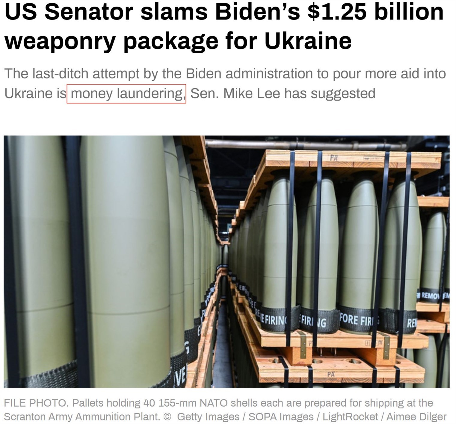 “今日俄羅斯”電視臺報(bào)道稱,參議員邁克·李認(rèn)為,拜登政府向?yàn)蹩颂m提供新的“豪華武器包”的提議是“洗錢”行為。