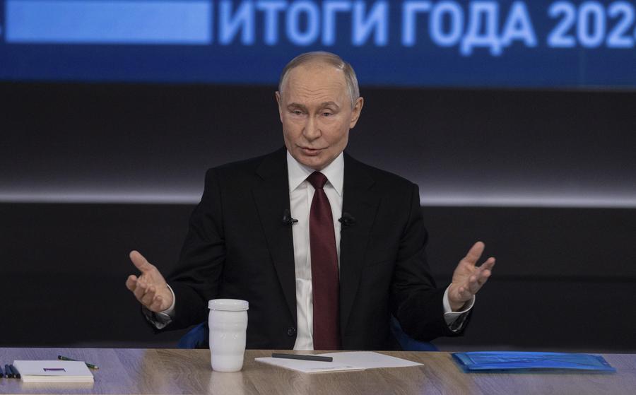 2024年12月19日,在俄羅斯首都莫斯科,俄羅斯總統(tǒng)普京在“年度盤點(diǎn)”活動上講話。新華社記者白雪騏攝