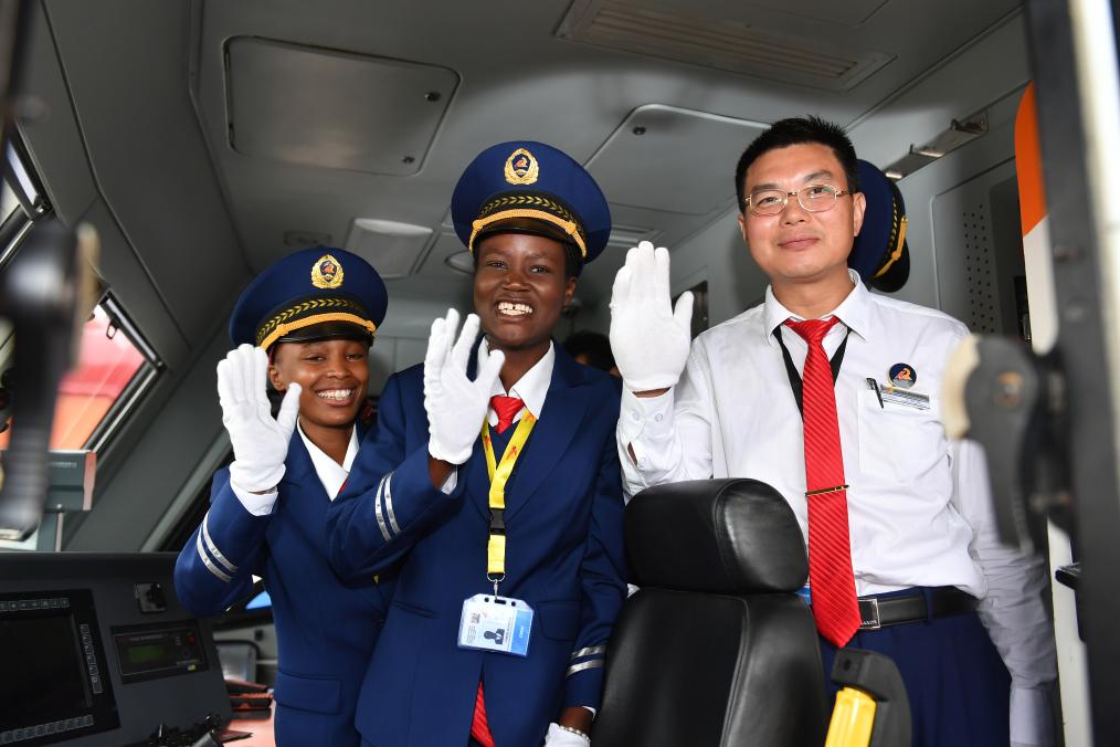 2017年5月31日,在肯尼亞蒙內(nèi)鐵路蒙巴薩西站,火車(chē)司機(jī)艾麗斯(左)、肯西莉亞(中)和旅客列車(chē)指導(dǎo)司機(jī)涂主新在蒙內(nèi)鐵路首班列車(chē)發(fā)車(chē)前揮手致意。(新華社記者孫瑞博攝)