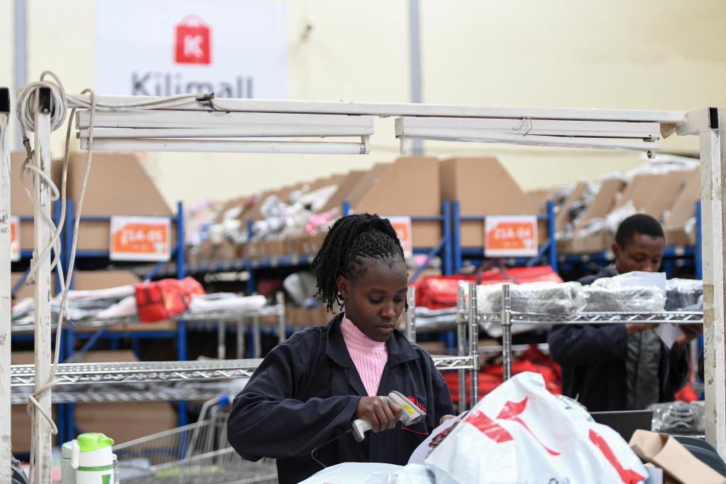 2023年7月28日,在肯尼亞姆洛隆戈,湖南長(zhǎng)沙非拓信息技術(shù)有限公司旗下電商平臺(tái)Kilimall的員工在倉(cāng)庫(kù)內(nèi)分揀貨物。(新華社記者李亞輝攝)