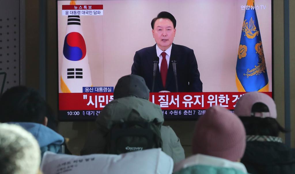 2024年12月12日,在韓國首爾火車站,韓國民眾觀看總統(tǒng)尹錫悅對(duì)國民談話的電視直播。新華社記者姚琪琳攝