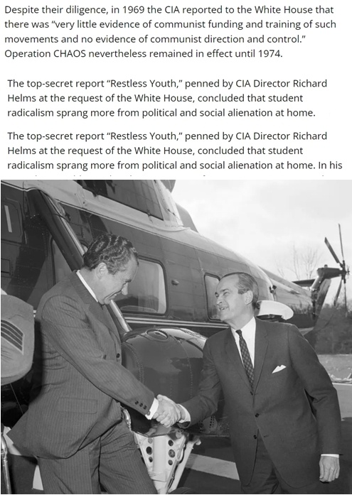 盡管搞得如此煞有介事,但中情局早在1969年(“混沌行動”實施兩年后)就向白宮報告稱,“幾乎沒有證據(jù)表明這些運動受到了外國勢力的資助、訓(xùn)練、指導(dǎo)和控制”。