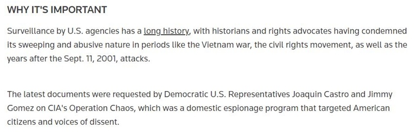 正如路透社所說,美國政府機構(gòu)的監(jiān)聽監(jiān)視行為歷史悠久,歷史學(xué)家和民權(quán)倡導(dǎo)人士在越南戰(zhàn)爭時期、民權(quán)運動時期以及“9·11事件”發(fā)生后的歲月里,都曾譴責(zé)過這種行為的廣泛和濫用性質(zhì)。