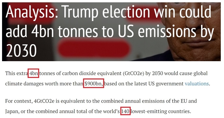 有報告指出,相對于目前水平,特朗普的再度掌權(quán)將讓美國到2030年的碳排放累計增加40億噸二氧化碳當量,比全球排放量最少的140個國家的排放總和還要多。