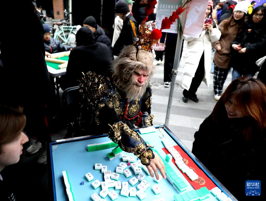 今年,倫敦卡姆登集市首次舉辦了中國春節(jié)慶典活動。喜慶的春節(jié)燈飾高高懸掛,在微風中輕輕搖曳;空氣中彌漫著中式點心的香氣,令人垂涎欲滴。人群中,偶爾可見漢服衣袂翩然掠過,許多人手中還拿著紅色的燈籠和“?!弊?。在慶典活動上,當?shù)厥忻裾淠荨っ谞栁值乱贿吅爸芭觥?,一邊開心地將麻將桌上的“南風”牌收到面前。她不僅自己打得得心應手,還不時給身邊的新手講解規(guī)則。